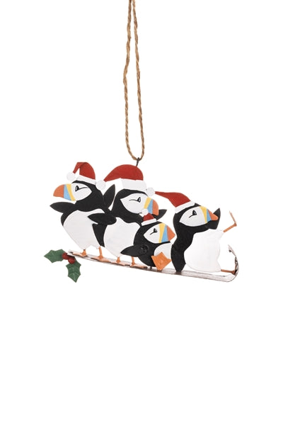 Watch these cheerful puffins zoom down snowy slopes right on your Christmas tree! Add a playful coastal flair to your holiday display with these charming sledging companions. They're the perfect way to inject some seaside fun into your festive decorations.