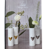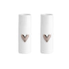 A pair of slim and elegant white vases with silver hearts. These handmade vases are made of embossed and partly glazed porcelain and are a timelessly beautiful gift.